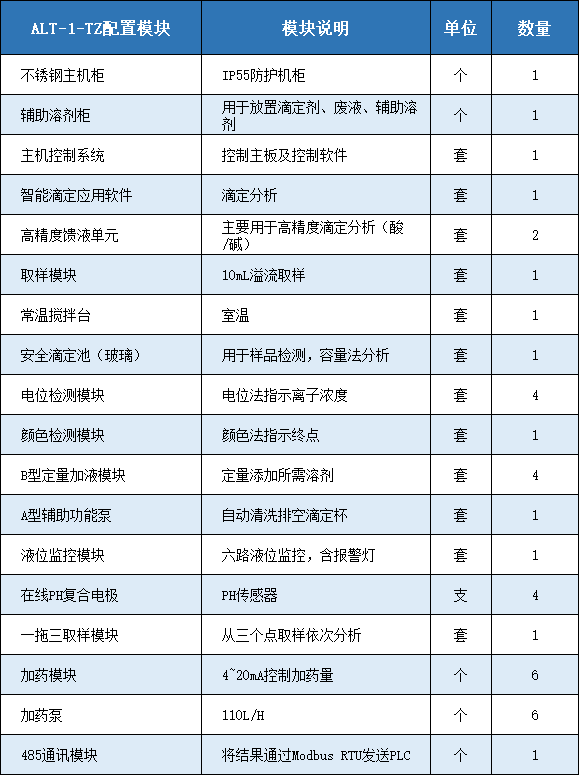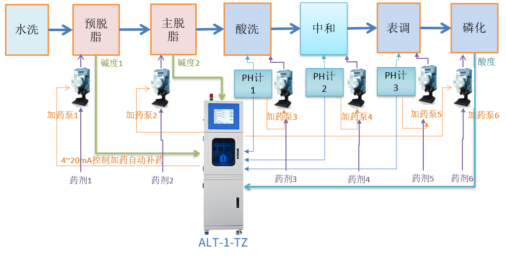 ALT-1-TZ涂裝行業(yè)專用在線分析儀,能夠實(shí)現(xiàn)對兩個脫脂槽(預(yù)脫脂和主脫脂)和一個磷化槽的自動取樣、自動樣品定量、自動滴定分析、自動清洗、自動計算分析結(jié)果,并保存分析記錄,同時根據(jù)分析結(jié)果對槽液進(jìn)行藥劑補(bǔ)加,使兩個脫脂槽的堿度指標(biāo)以及一個磷化槽的酸度指標(biāo)符合生產(chǎn)工藝控制要求。另采用3個在線PH探頭分別監(jiān)測酸洗槽、中和槽和表調(diào)槽的酸堿值,PH電極固定在槽液中,設(shè)備定時從PH計讀取的PH值并保存,再根據(jù)PH值與目標(biāo)值的偏差控制加藥泵對槽液進(jìn)行補(bǔ)藥。