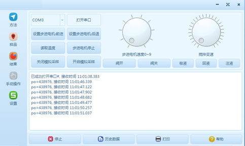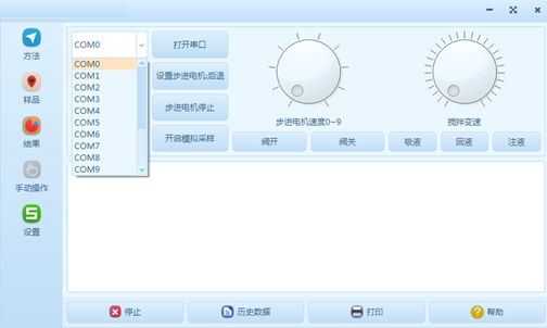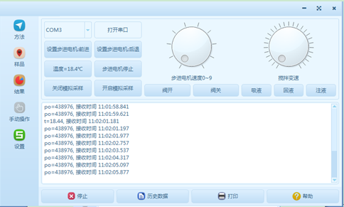 “步進電機速度”可以調(diào)節(jié)步進電機的運動速度,“攪拌變速”可以調(diào)節(jié)攪拌臺的攪拌速度;