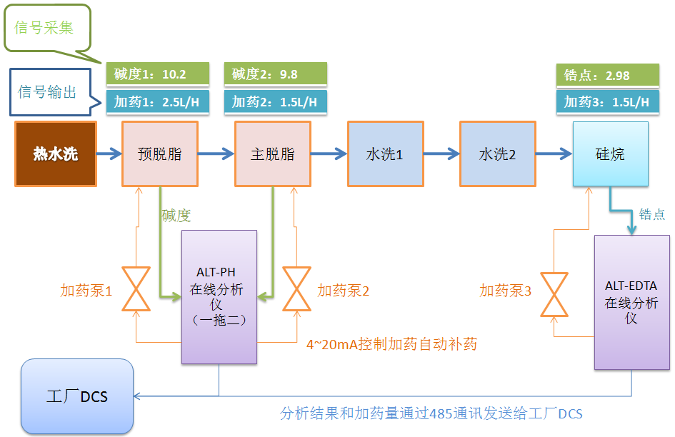 ALT在線分析在獲取分析結(jié)果后,可控制加藥泵對工藝槽液進行藥水補加,使槽液的指標(biāo)控制在工藝要求的范圍內(nèi)