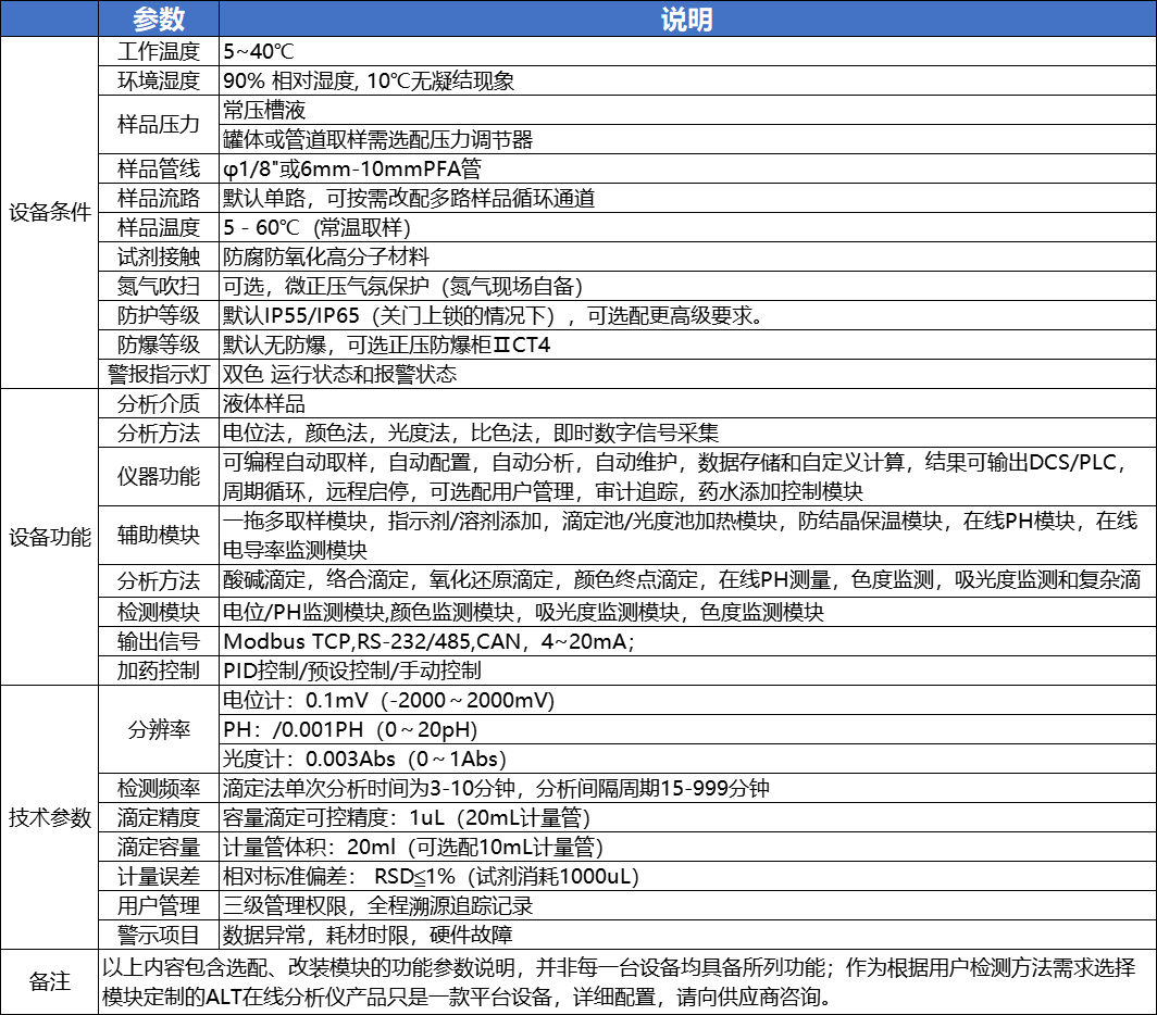 ALT-SED工業(yè)過程沉淀滴定在線分析儀采用A8處理器,模塊化設(shè)計(jì), 七英寸中文人機(jī)對話全彩觸摸屏,高精度滴定管、電磁切換閥、長壽命溶劑泵,高分辨率的顏色采集模塊和多樣的檢測模塊,可通過測量電極的電位變化和顏色變化的自動判斷,來指示滴定的終點(diǎn),根據(jù)樣品性質(zhì),儀器選用不同電極和檢測器進(jìn)行自動顏色滴定、pH滴定、氧化還原滴定、絡(luò)合滴定、非水滴定和沉淀滴定等多種滴定,適用于化工、環(huán)保、食品、制藥、造紙、紡織、冶金、金屬表面處理、水質(zhì)處理等領(lǐng)域。